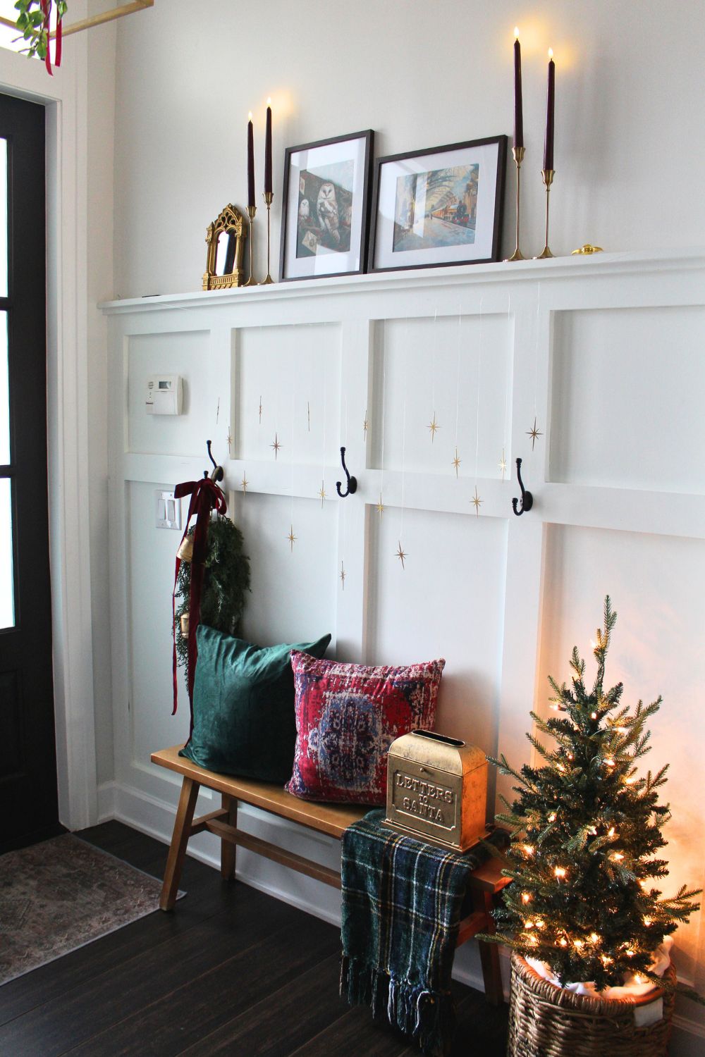 When getting ideas for a Harry Potter Christmas theme I came upon 8 pointed stars a lot. So I wanted to implement those in my decor wherever I could! I found these little gold stars and hung them on my DIY entryway board and batten wall ledge.