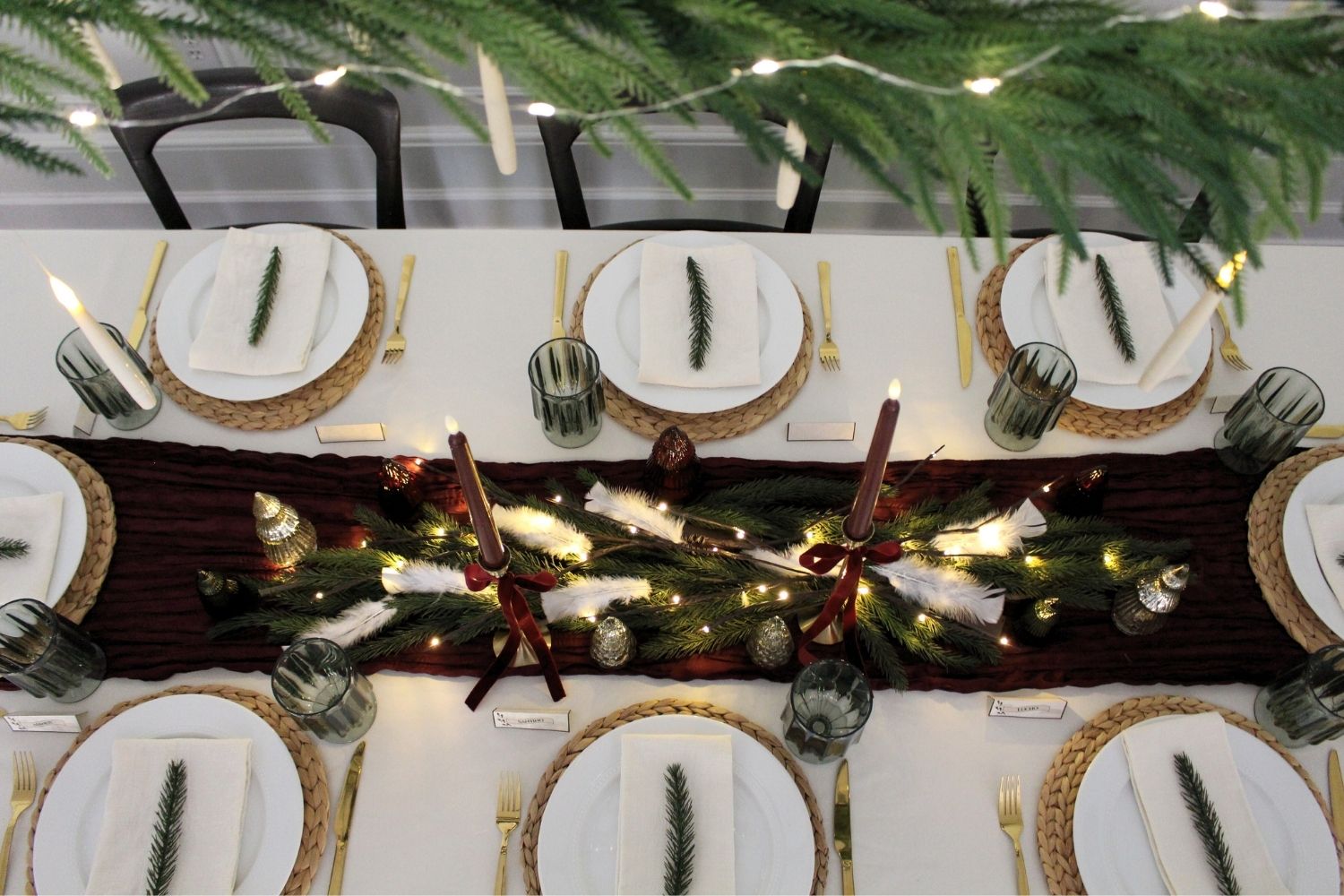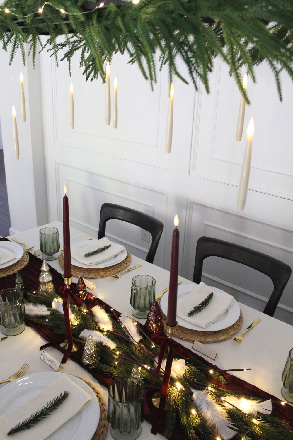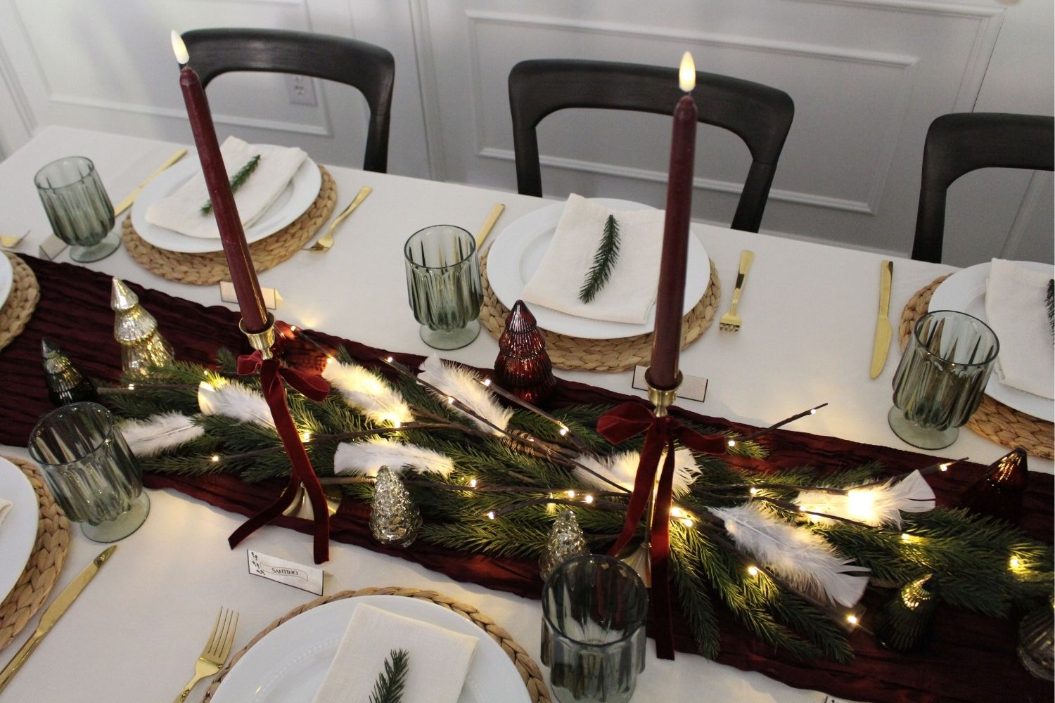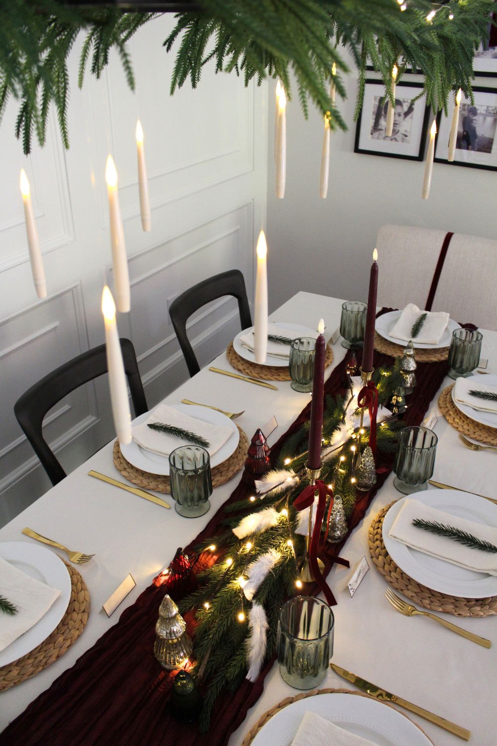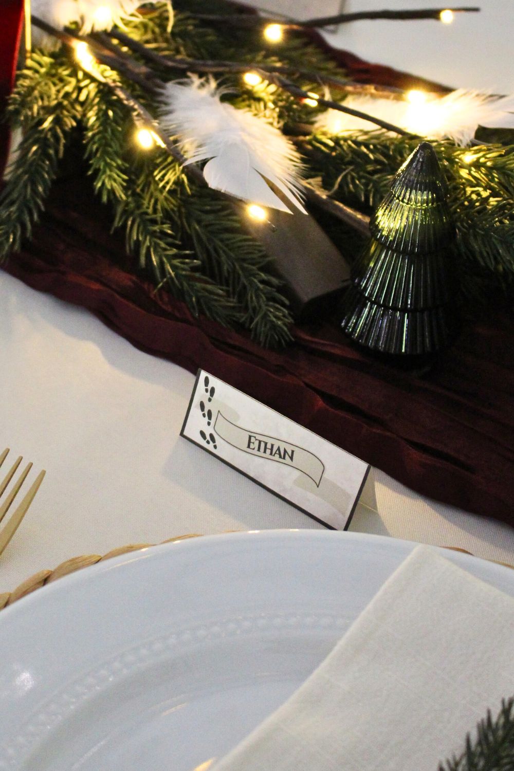 You can choose your own font and obviously turn the name a little at a diagonal so that it fits within the banner. Below are some more pictures of my Christmas table setting with just a few Harry Potter touches, including the floating candles, name tags and “owl” feathers.
